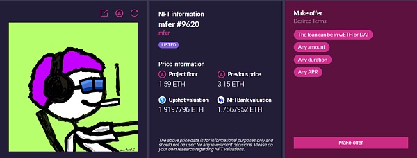 NFT持有人将他们持有的NFT抵押进该类别的池子中,抵押品的价格由平台收集的该类别在市场上的地板价决定,然后获得抵押品价值30%左右的借款,同时需要向平台支付一定的利息。