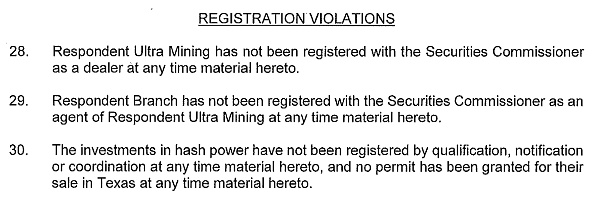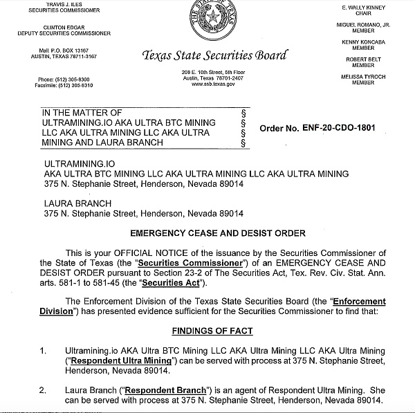 根据得克萨斯州证券委员会(TSSB)的行政令文件,得克萨斯州证券委员会(TSSB)指控Ultra BTC Mining出售未注册的证券,并通过对回报做出误导性陈述“从事欺诈”。