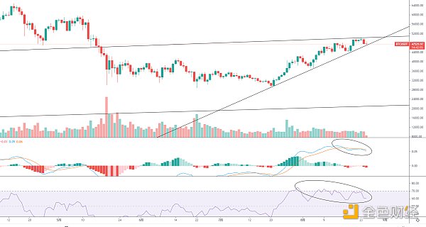 短线看,新高顶背离,近期迎来调整,再次贴近这一波反弹上涨趋势线,后面要观察能否在这一带止跌,日线一旦有效跌破,短线就要考虑逢反弹减仓,目前日线支撑在47000美金附近,中期多头支撑仍是120日均线,不破中长线耐心持有,逢低补仓。