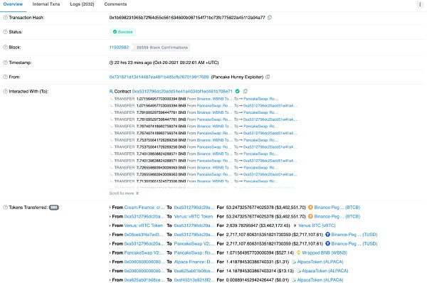北京时间 10 月 20 日晚,知道创宇区块链安全实验室 监测到 BSC 链上的 DeFi 协议 PancakeHunny 的 WBNB/TUSD 池遭遇闪电贷攻击,HUNNY 代币价格闪崩。实验室第一时间跟踪本次事件并分析。