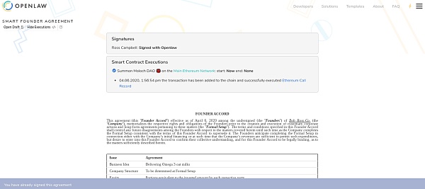 此外,在投票记录于以太坊之前,可通过OpenLaw表格对创始人的决定进行编程,需要法律描述,电子签名记录以及利益相关者的批准: