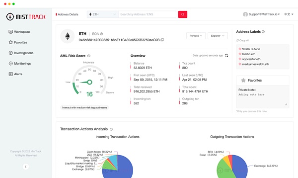通过标记 1 千多个地址实体、2 亿多个地址标签,10 万多个威胁情报地址,以及超过 9000 万个与恶意活动相关的地址,MistTrack 为反分析和研究提供了全面的情报数据帮助。通过对任意钱包地址进行交易特征分析、行为画像以及追踪调查,MistTrack 在反分析评估工作中起到至关重要的作用。