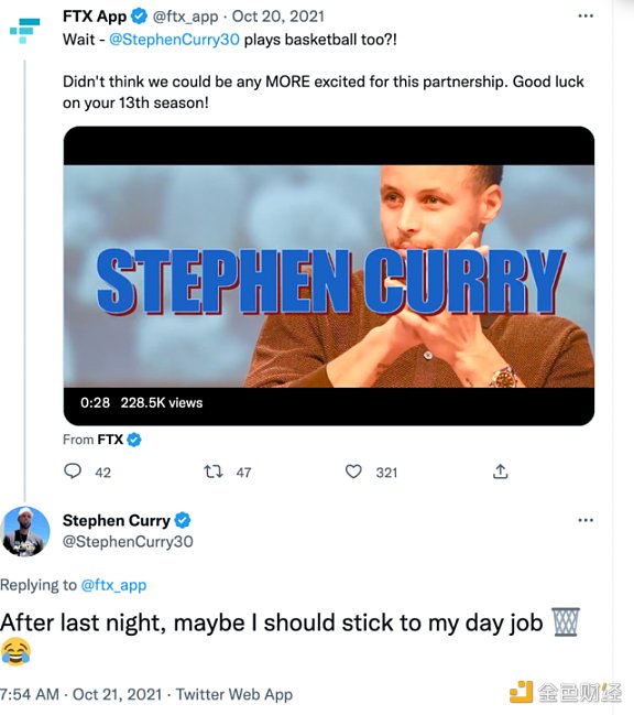 在今年 3 月与奥尼尔合作拍摄的宣传片中,库里更是称 FTX 帮助他成为了加密货币交易「专家」,并说:「有了 FTX,我有了可以安全交易所需的一切。」