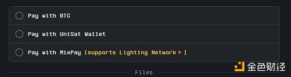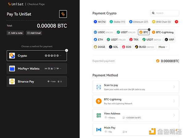 提供了三种支付方式,1、直接用BTC支付;2、用UniSat钱包支付;3、用MixPay支付。1、2打开可以直接支付,3界面如下: