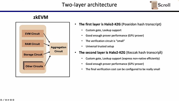 因为在L1上直接验证上述的EVM电路,内存电路,存储电路等,开销巨大,Scroll 的证明系统采用了两层架构。