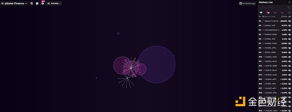来源:CoinGecko,Coinmarketcap,DeFi Llama,Mint Ventures,数据截至2023年4月11日从静态估值来看,pSTAKE Finance明显偏高,高估值可能与PSTAKE筹码分布过于集中有关系:目前PSTAKE75%以上的筹码集中在几个地址中,其中一部分是还未释放的token。流通市值相对较小给市场中的投资者提供了较大的炒作空间,相比于Lido现阶段85%的token已经进入流通阶段的情况而言,PSTAKE的价格更容易受到做市商的影响。