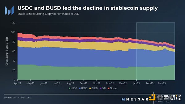 ETH上的稳定币在本季度减少了130亿美元,降至730亿美元。在Circle宣布其部分储备位于破产的硅谷银行后,USDC的供应量减少了100亿美元。由于Paxos宣布将根据纽约金融服务部(NYDFS)的指示,结束与币安的合作关系,BUSD的流出为50亿美元。在这场混乱中,USDT表现出色,其供应量增长了40亿美元。