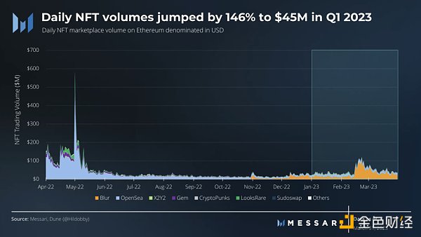 2023年第一季度,每日NFT交易量激增146%,达到4500万美元。Blur空投活动后,活动明显增加。Blur以每日2900万美元的交易量领跑NFT交易量占比,达到64%。其次是OpenSea,每日交易量为1100万美元,交易量占比为25%。