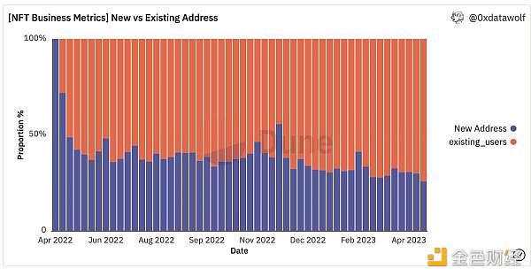 更可怕的是,NFT 没啥新用户了。去年 4 月份以来,新用户占比逐渐下跌。新用户比例少,就意味着没有太多的增量资金。可见 NFT 市场,的确处在熊市,完全没有走出来。