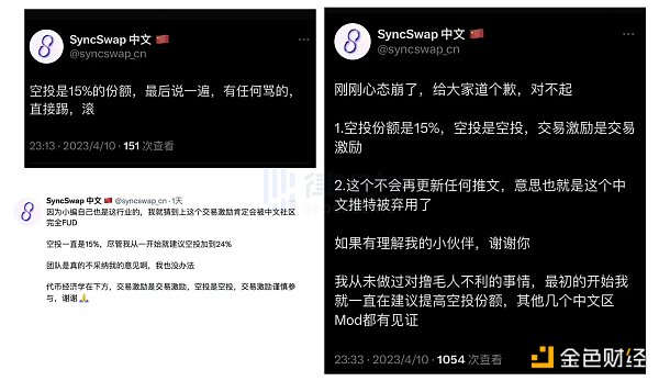 SyncSwap 的社区讨论风波的源头是 SyncSwap 社交媒体中文区的几次发文。在最近的一次发文里,SyncSwap 中文道歉称:「空投份额 15%,空投是空投,空投激励是空投激励」,且表示该社交媒体账号已被 SyncSwap 账号弃用。