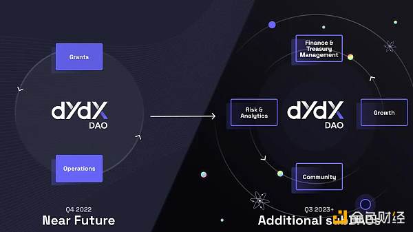 可以说,dYdX V 4 在主网上的发布标志着 dYdX 协议去中心化的转折点。从那时起,dYdX DAO 将单独并完全负责 dYdX 协议运行的所有方面。为此,dYdX 基金会在社区内部发布了关于 dYdX DAO 的潜在路线图。