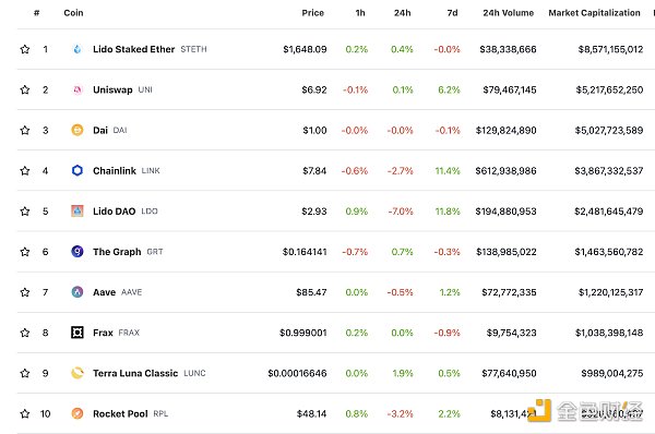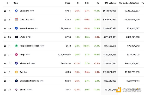 DeFi总市值及前十代币 数据来源:coingecko