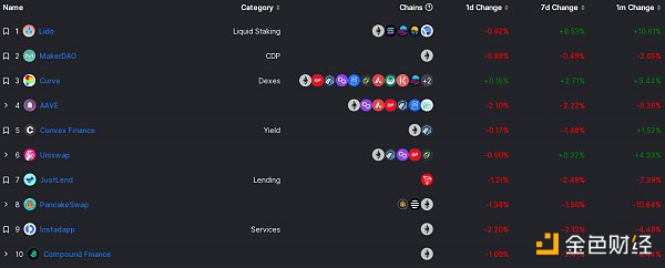 DeFi项目锁定资产前十排名及锁仓量 数据来源:defillama