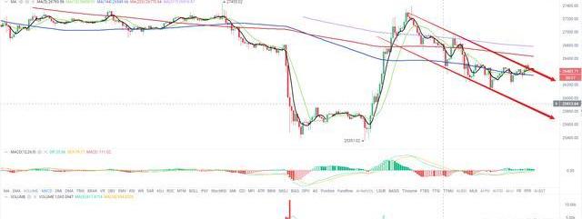 昨天分析到:大饼btc会不会发生倒V型反转,大饼需要跌破2.65w,显然从今天走势图中不难发现,btc已经处于30min的价格下降通道,同时也跌破了2.65w,只不过是今天下跌速度放缓,以横盘出现,那么会不会横盘后继续上涨,看基本面有点难,同时纳斯达克指数,昨天也明显出现下跌,可能昨天的高点就是暂阶段的顶,很有可能大饼会随着后期美股指数下跌,然后瀑布,情况还是有可能发现。显然的是,一旦btc完全倒V型反转,后面肯定会加速下跌,直接跌破2.4w也有可能,日线下方支撑位置在2.27w附近。