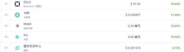 今天涨幅最大的是MultiversX(Elrond)、Kaspa和RenderToken