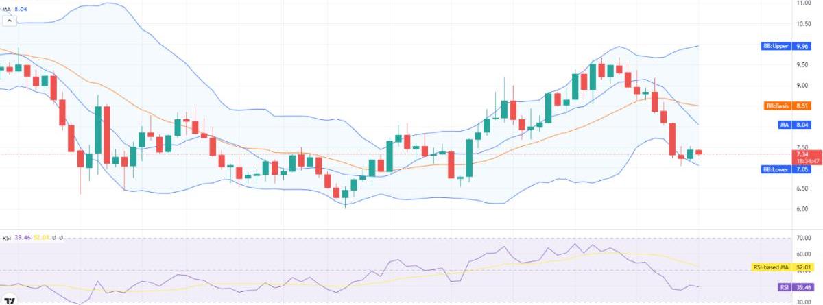 由于布林带显示出急剧收敛,波动性正在下降。上限已达到7.68美元关口,代表DOT/USD对的阻力位,下限已达到7.14美元关口。由于过去四个小时内重新建立购买活动,RSI曲线在指数34处趋于平缓。