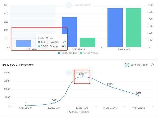 不过综合交易量来看,11月2日Gobblers爆发时,当天的Token交易量达到3508,但当天的钱包地址中的总金额却接近0,这说明当天用户在产生trasnfer行为后,将GOO质押到合约中去获取收益。