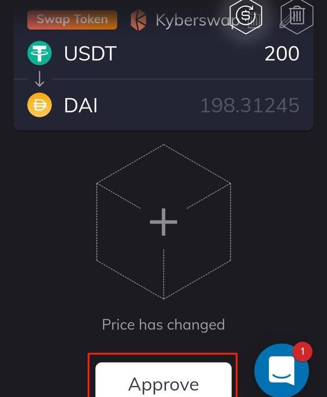 我选了用USDT兑换DAI,输入200USDT,系统会显示这个应用中当时能够兑换的DAI数量:198个