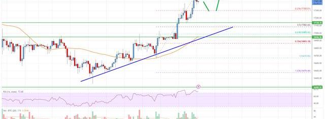 查看图表,比特币价格明显高于17,000美元和55条简单移动平均线。总体而言,如果价格保持在17,000美元的阻力位上方,价格可能会继续上涨。