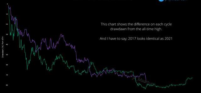 就像上一个周期一样,比特币在顶部之后猛跌,直到ATH的回撤达到70%的值。