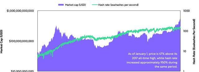 支持哈希率急剧上升是硬件和矿工基于对比特币价格随时间升值的预期而进行投资的意愿。有趣的是,仅仅在过去的几个月里,比特币的价格才超过了2017年的高点,在此期间比特币的哈希率增加了950%。