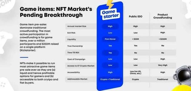 正是看到NFT的优势,Gamestarter首创将传统众筹机会与代币融资的优点相结合的平台,打破原有众筹的规则,构建游戏众筹的新玩法。