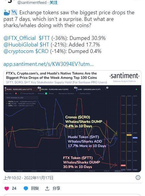 因此,可能由于某种原因,市场参与者只是选择退出交易所并抛售各自的原生代币。根据链上平台Santiment,过去7天最大的输家包括热门交易所的原生代币。