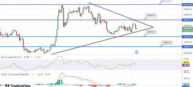 在4小时图上,比特币在23,750美元的关键水平遇到阻力,难以突破。因此,BTC价格出现看跌修正,可能跌向22,800美元的支撑位。如果该支撑位未能守住,下一个支撑位可能在22,150美元附近。