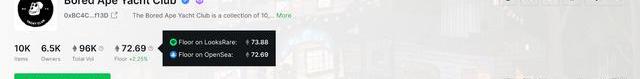 计算NFT地板价最简单的方法就是参考藏品系列中最低的NFT价格。比如在Opensea上,无聊猿猴游艇俱乐部系列NFT的地板价是72.69ETH,这是BAYCNFT在市场上挂出的最低价。