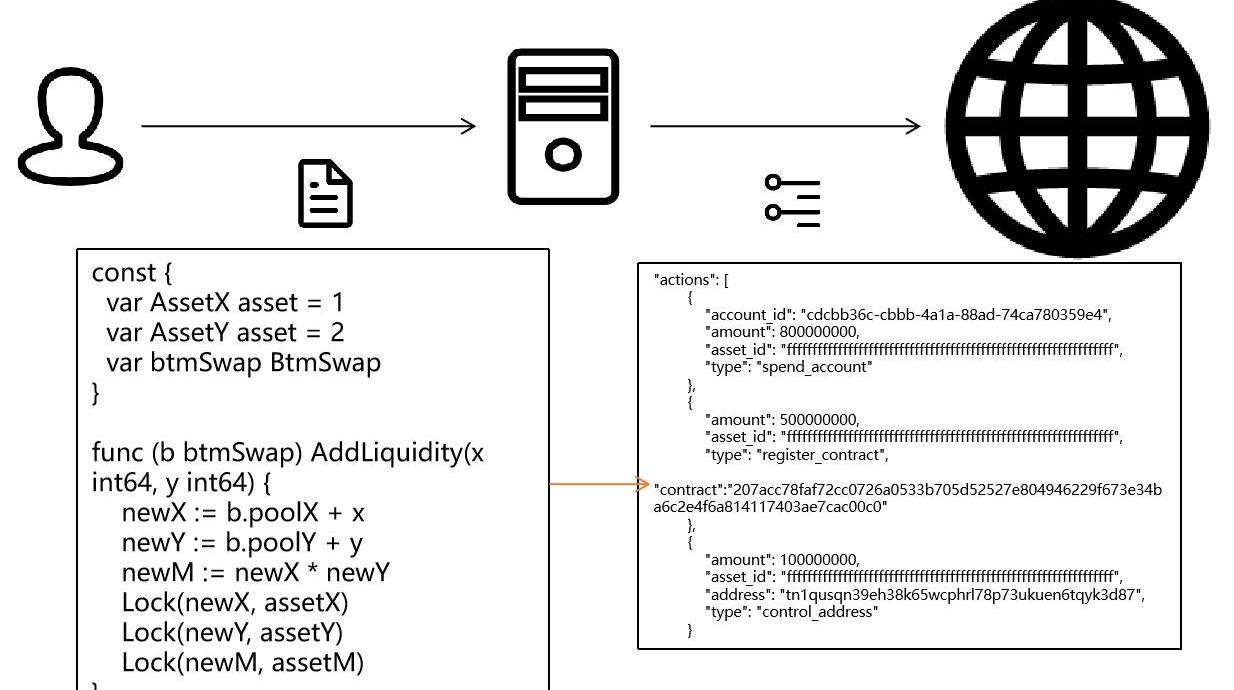 注册合约即通过销毁一个UTXO向链上写入一个合约代码,通过该合约的哈希即可直接使用该合约的代码。注册合约可以通过该方式联系到Bytom1.0中的合约模板,但合约模板只是给开发者一个参考,开发者需要自己把合约模板部署到链上,而注册合约注册完成后,开发者可以直接调用。
