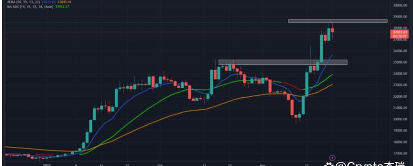 比特币越来越接近确认熊市的结束并将目光投向30,000美元区域。然而,目前的交易价格为27,500美元,随着BTC进入一个新的、完全形成的牛市趋势,它正接近一个强大的阻力区域28,600美元。