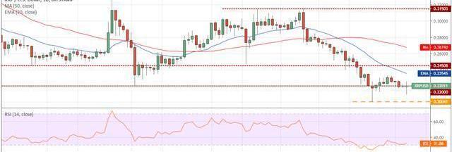 XRP美元日线图。来源:Tradingview如果空头下沉并将价格维持在0.22美元以下,则则有可能再次探底至0.20041美元。新的52周低点将是一个巨大的负值,并将价格拖至0.18美元。