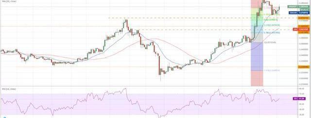 两个移动均线均在上升,RSI仍在超买区域附近,这表明多头处于主导地位。