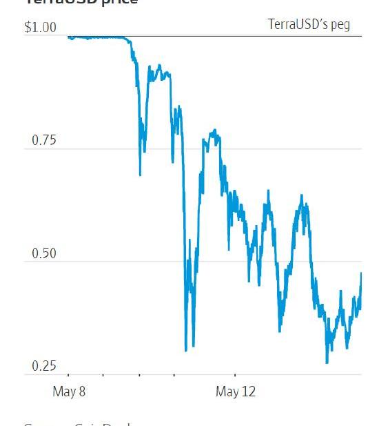 崩盘给投资者带来了数十亿美元的损失。波动进一步影响到了其他加密货币,导致比特币价格也大幅下跌。另一种稳定货币tether周四小幅下跌至96美分,然后重新与美元挂钩。