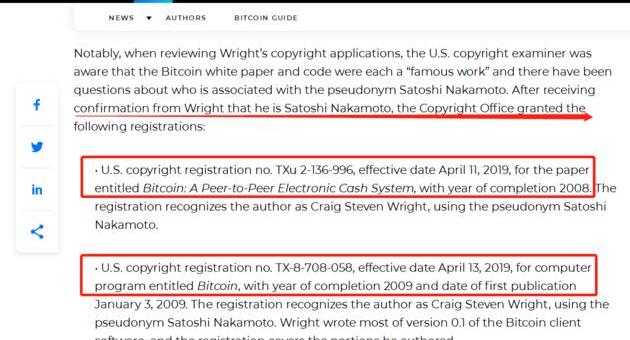 同时,文章还表明,美国版权局是在收到CraigS.Wright确认是中本聪的文件后,才授予了注册。