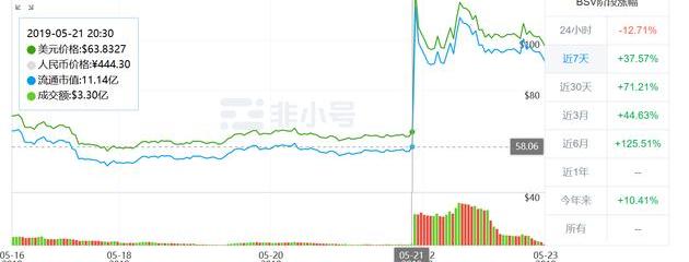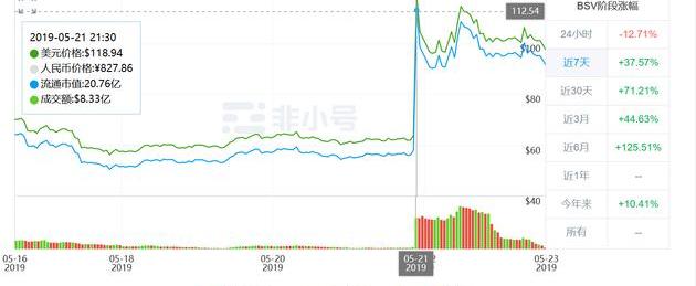加密货币行情网站非小号也显示,5月21日当晚8点半,BSV单价还报63美元,稍后就直线上涨,当晚9点半左右,BSV单价已达119美元,1小时暴涨87%,流通市值也增加9.62亿美元,从11.14亿美元,暴增至20.76亿美元。截止当前,BSV单价报收100美元左右。