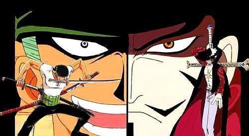 第一个出场的七武海,在早期就遇到了路飞和索隆,并被索隆挑战。面对索隆全力使出三刀流奥义,鹰眼只靠着胸前的十字架小刀就打败了索隆。后来的顶上战争,再度展现了世界第一大剑豪的实力,远距离的剑气和斩断了青雉的冰河时代,最后红发海贼团的介入,让他有理由收手脱身。草帽海贼团修炼的两年间,在索隆诚心诚意的跪求和完成了他所提出的“试炼”后,成为了索隆的师傅,索隆在两年后也不负所望被认可。