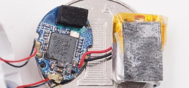 电池用双面胶固定在耳机主板上,几处焊点胶水加固。与一元硬币对比尺寸大小。