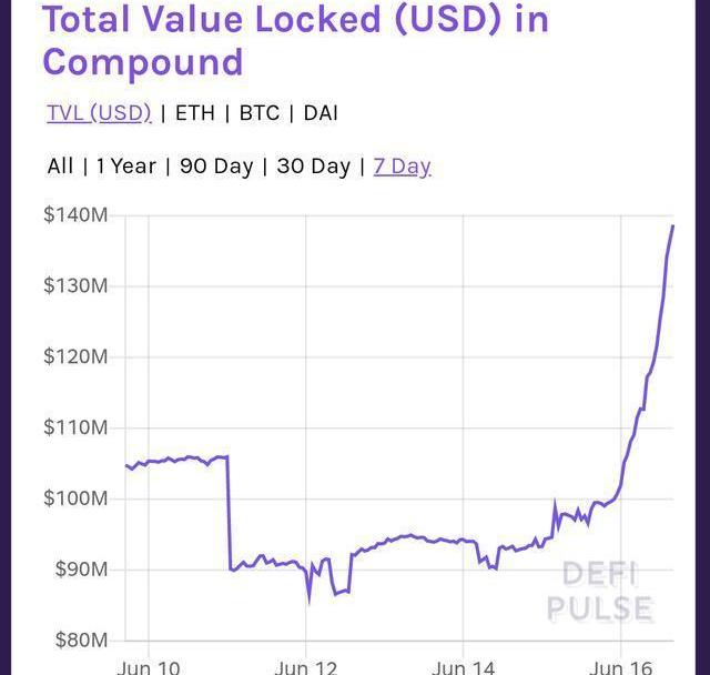 去里面锁定资产就可以挖矿,所以7天内compound锁定资产曲线是这样的:
