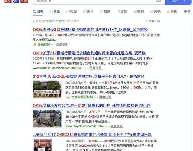 我尝试在百度中搜索了一下okex312,发现居然没有一篇负面,统一的消息:okex要赔偿。
