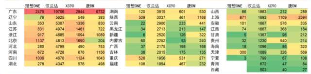 理想ONE主要的竞品为汉兰达、沃尔沃XC90、唐DM等中大型SUV,我们通过对比各车型的分区域销量,认为理想ONE还有很大的渠道拓展空间。我们通过对比竞品的销售区域分布,发现汉兰达、XC90卖得好的区域,是大型SUV的核心潜在市场,例如辽宁、山东、湖南、云南等省份;比亚迪“唐DM”卖得好的区域,体现的是插电混具有的“双卡双待”优势,例如:上海、西安、石家庄等。随着理想销售网点下沉,预计销量仍有提升空间。