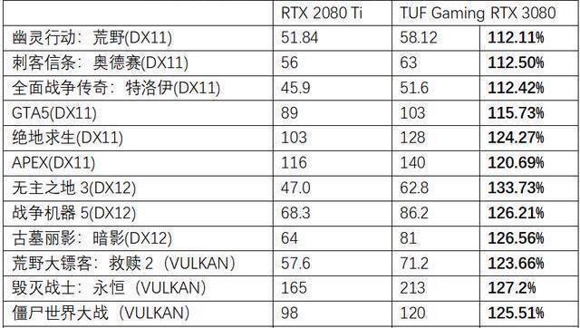 2K分辨率下,TUF-RTX3080-O10G-GAMING相对于RTX2080Ti的提升进一步拉大,大部分游戏性能的提升在20%以上,而采用VULKANAPI的《异域奇兵》性能提升则已经超过了30%。