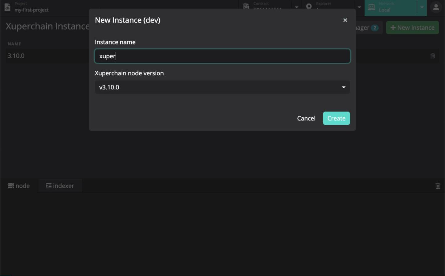 点击主页面中右上角的?NewInstance?按钮打开创建新实例的弹窗,填写实例名称和选择合适的版本,点击?Create?按钮完成节点实例的创建。
