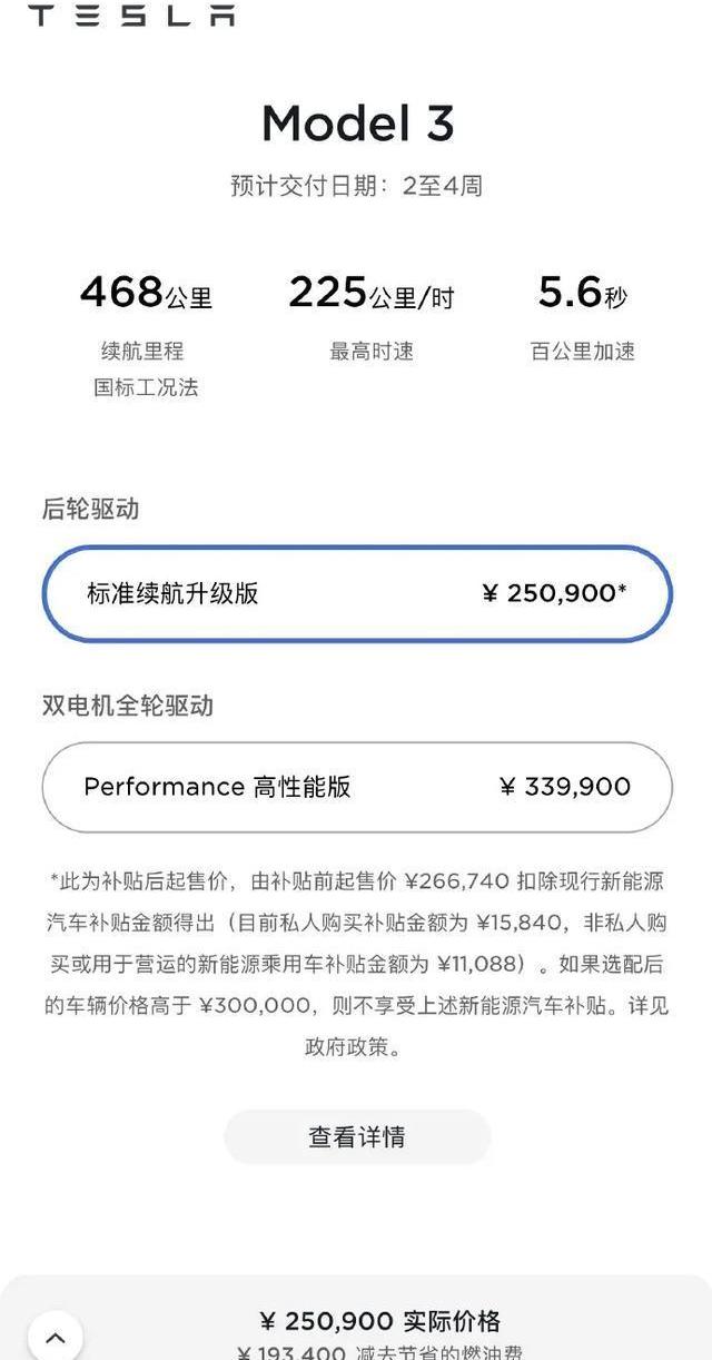 上调之前,标准续航升级版Model3在国内市场补贴后价为25.09万元;非私人购买的补贴为1.11万元,起售价为25.57万元。