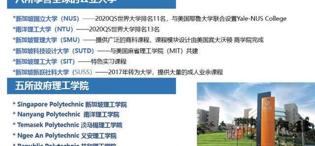新加坡本地两所名校新加坡国立大学和南洋理工大学是全亚洲数一数二的高等学府,在2020年QS世界大学排名中并列世界十一名。这两所学校每年都招收了大量的中国留学生,今年更是和新加坡政府通力合作,为更多的中国学生顺利入学提供了诸多便利,包括拓展招生名额、在校内提供舒适的隔离设施等等。