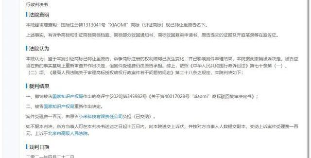 之前,小米科技有限责任公司与国家知识产权局其他一审行政判决书公开,诉争商标为“xiaomi”,引证商标“XIAOMI”就已经转让至原告小米公司旗下。