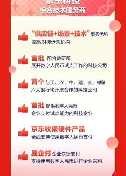 近日,京东还创新实现了京东第三方商家接入数字人民币系统,成为全国首批支持自营+第三方商家使用数字人民币的企业。京东科技提供的综合技术支持,进一步丰富了京东生态内的数字人民币试点应用场景,助力众多产业带源头商家和中小型实体商户充分参与数字人民币试点,让更多的用户在更多场景体验数字人民币时更便捷。