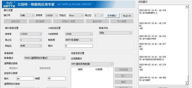 通过ECAN-401的上位机,将设备通讯模式切换为透明带标识模式,CAN波特率1000K,ID长度2,ID位置2参数配置如下图:
