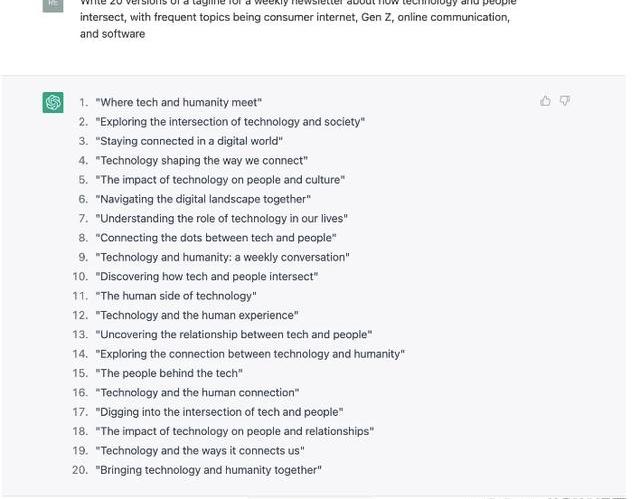 就像人工智能增强了创意一样,人工智能也增强了生产力。我们在赋予作者和营销人员超能力的工具中就能看到这一点,比方说像Jasper.ai、Copy.ai、Lex这样的工具。我让ChatGPT帮我头脑风暴,给我的自媒体设计新标语,它的推荐令人印象深刻: