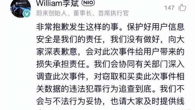 当日晚间,蔚来创始人、董事长、首席执行官李斌就数据泄露一事在蔚来官方社区致歉。